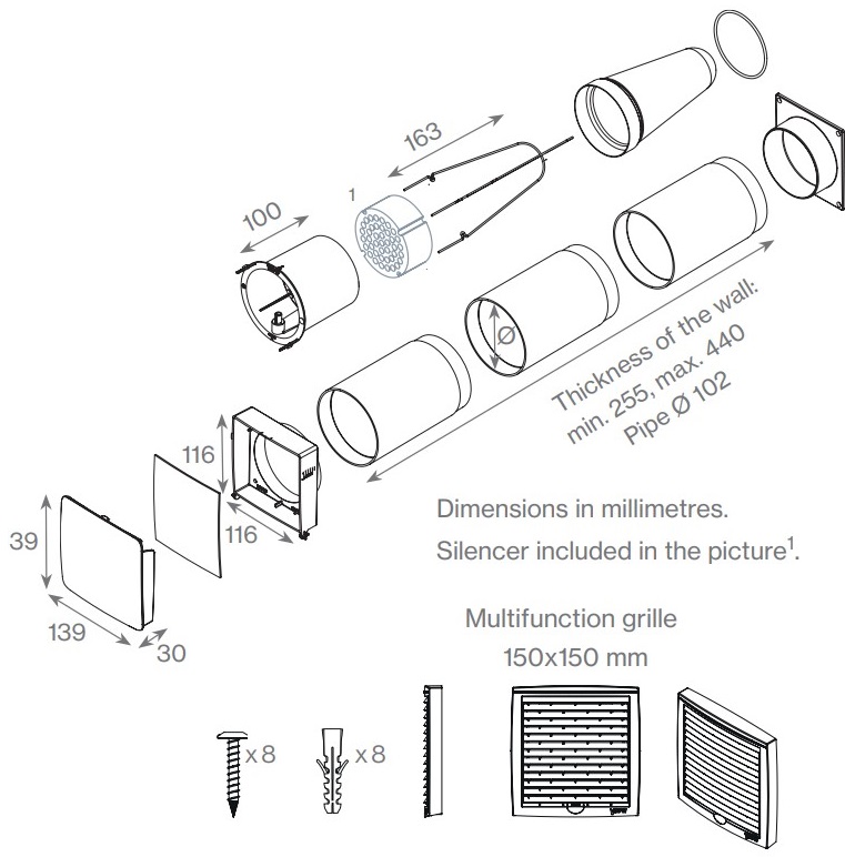 A VILPE Wive felszerelése gyors és egyszerű, mivel nincs szükség csatlakozókra vagy elektromos vezetékekre. Nagyobb falvastagság esetén a termék dobozában megtalható 44 cm hosszű falátvezetőcső további 16 cm-el meghosszabbítható lehet (opcionálisan rendelhető kiegészítő). A termék használható termosztáttal és termosztát nélkül is, a telepítési körülmények és a felhasználói igényeknek megfelelően.